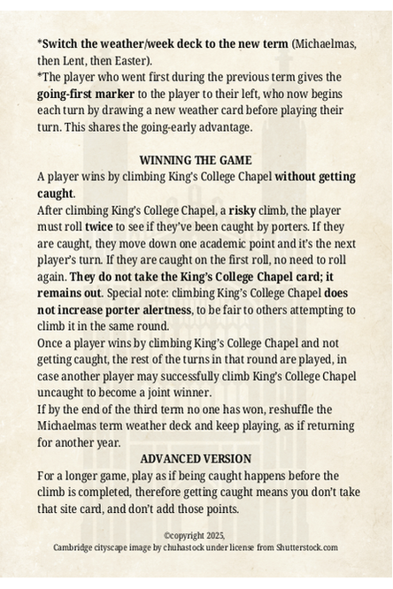 In the shadowy traditions of Cambridge University lurks a daring pursuit: night climbing. "Night Climbers of Cambridge: The Game" invites 2-4 players to scale the iconic buildings of this ancient university under cover of darkness.